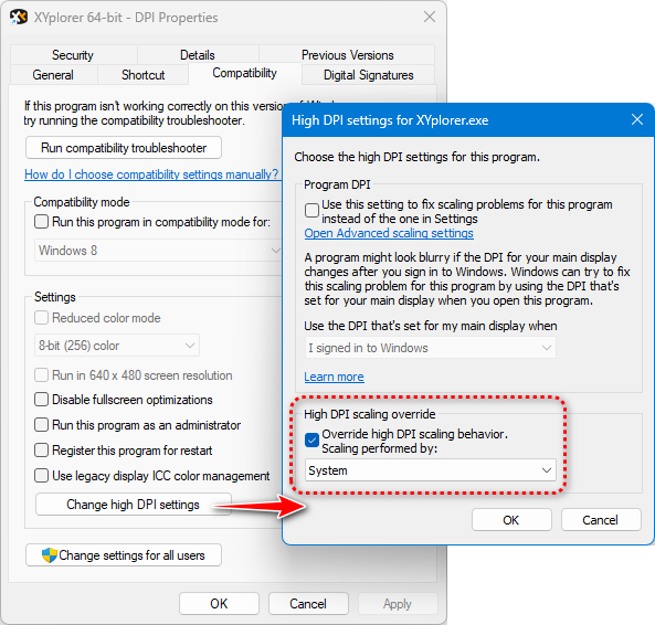 可以通过更改 XYplorer.exe 或其快捷方式的属性来显著改善此问题。右键点击文件或快捷方式并选择"属性",然后打开"兼容性"选项卡并点击"更改高 DPI 设置",然后勾选"替代高 DPI 缩放行为"并在"缩放执行者"下选择"系统"。