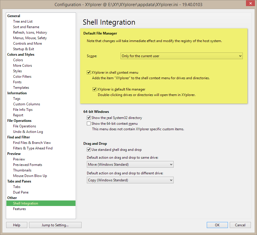 如果您使用的是便携式安装,请注意 64 位版本与 32 位版本的配置文件完全兼容。只需覆盖可执行文件(XYplorer.exe 和 XYcopy.exe)即可无缝继续使用。